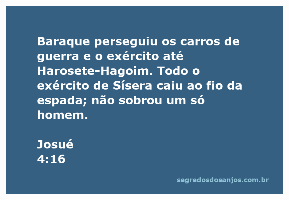 Baraque perseguiu os carros de guerra e o exército até Harosete-Hagoim. Todo o exército de Sísera caiu ao fio da espada; não sobrou um só homem.
